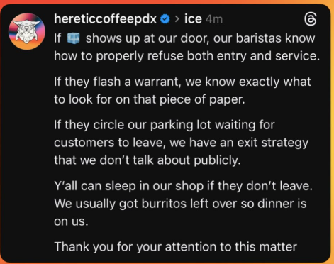 One of the ways that we're showing up for each other when the fascists try to take us down is with cash donations. When Portland-based Heretic Coffee first announced that they were offering free breakfasts to anyone losing their SNAP payment, a few cynics predicted that they would go bankrupt within a week, but instead, thousands of people who saw their post wanted to be a part of this kindness and donated what they could. As a result, Heretic Coffee ended up with well over $350,000 with which they are continuing their free breakfasts indefinitely as well as donating chunks of cash to other great organizations such as Black Futures Farm. And now, not only are they feeding hungry neighbours, but they're also providing shelter from ICE.