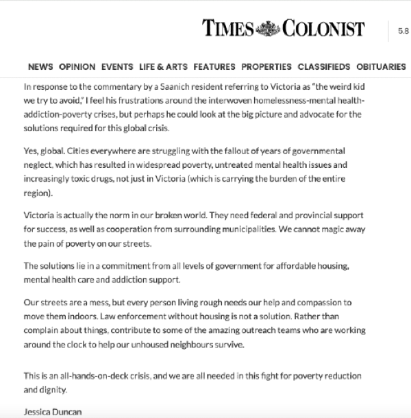 The other day I was walking with my friend Diane and I told her a story about how an advocacy group I'm part of worked together to produce this letter to the editor of our local paper, rebuking a suburban kvetcher who suggested homelessness & addiction are strictly a Victoria issue (as if!) and can/should be magicked away by law enforcement (sigh). Diane seemed to find my little tale of collaboration inspirational and suggested that I should write about it for this week's newsletter. So, here you go!