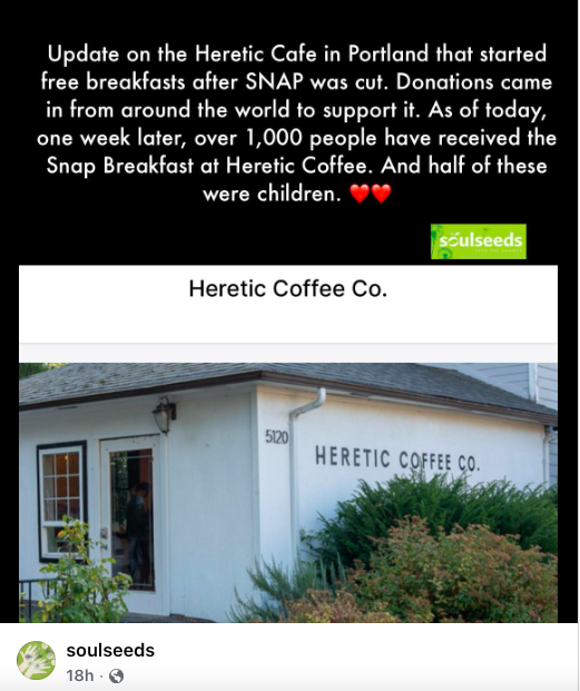 Of course, we're seeing incredible examples of collaboration everywhere, bringing moments of joy in tough times. Collaboration that might not have happened if things weren't so shitty for so many (no mud, no lotus). As someone who is passionate about feeding people, Josh from Portland-based Heretic Coffee Co has become a personal hero of mine, and the collaborative nature of this story fills me with so much joy. As the owner of Heretic Coffee Co, Josh has provided the facility, the food, and the commitment to care for his community by offering free breakfast to those who were losing their SNAP payments during the government shutdown. Others who had funds to spare, covered the cost of the free breakfasts with monetary donations. In fact, the financial contributions have been so overwhelmingly generous ($361,000 last count!), Josh is now looking at more ways to expand the support for his hungry community beyond free breakfasts at his coffee shop. Josh understands how humanity works: