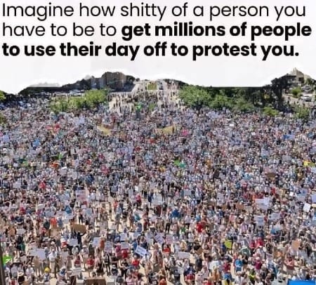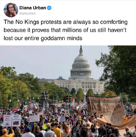 "Friends, it does us no good to pretend this is all OK. It’s not. It’s healthy to acknowledge that. What we can also do, however, is remind ourselves of the vast numbers of beautiful, feisty, patriotic Americans who showed up for No Kings this weekend—plus the many millions who wished they could be there but had other obligations—and imagine them standing on either side of us, literally propping us up. We are not alone. We are fighting a formidable opponent, but it is he and his cronies who are outnumbered—not us. It is they who will eventually be routed—not us. It is they who should worry about losing this battle—not us. In fact, our victory is inevitable. Not because tyrants always fall, but because we will make sure this one does so.