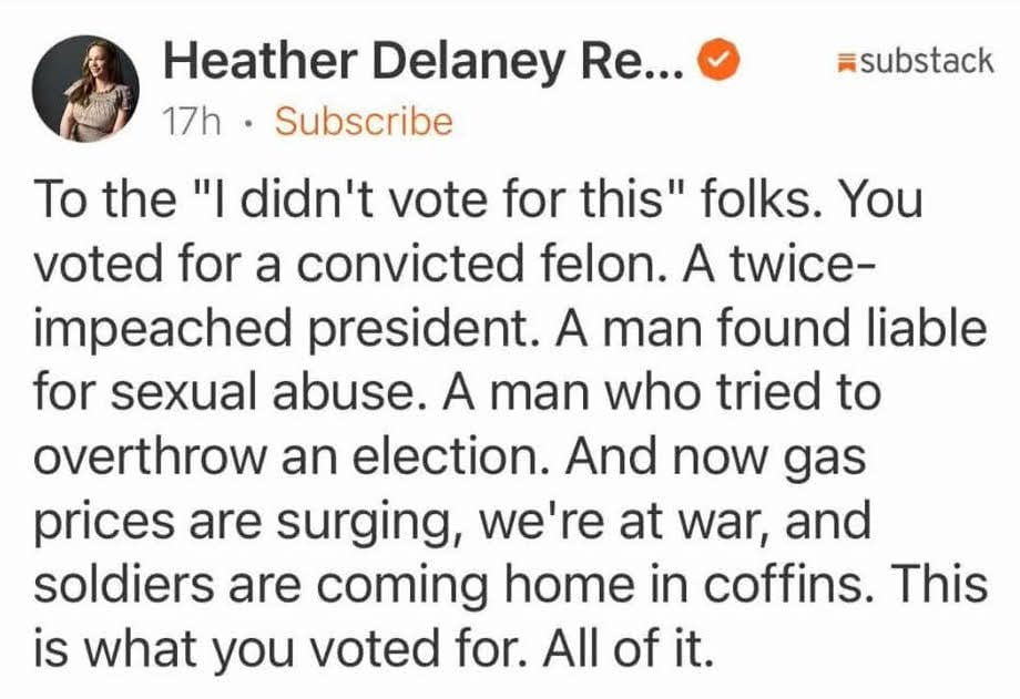 - Come home, sing to my cats about how much I love them, interspersed with chanting long strings of expletives aimed at the 70+ million who voted for this (zero patience for the ones who are now whining, "I didn't vote for this." - Yes you abso-fucking-lutely did!) and the millions more who couldn't be arsed to vote for Harris for whatever lame reason.
