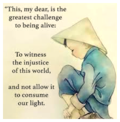 "This, my dear, is the greatest challenge to being alive: To witness the injustice of this world, and not allow it to consume our light."