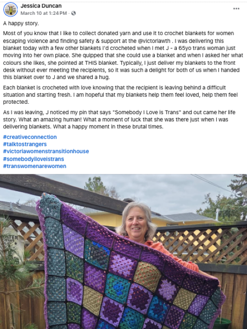 Earlier this week, I posted this story about my heartwarming exchange with J, the 65 year old trans woman who asked for this blanket I was donating to the local women's shelter. What I didn't mention in this post is that our interaction allowed me the opportunity to thank her for making the world a little safer for my trans kid. Later, when I was telling my kiddo this story, I reminded them that they have now made the world a little safer for my friend's six year old trans daughter. And on it goes, one generation after another.